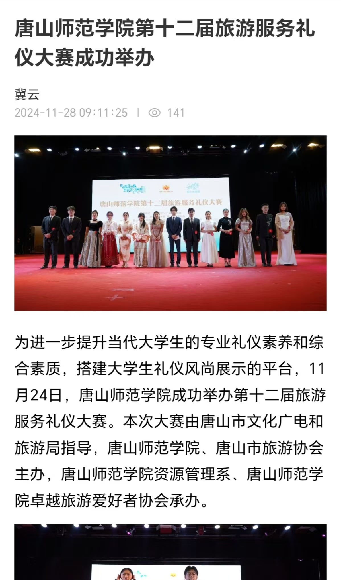 为进一步提升当代大学生的专业礼仪素养和综合素质,搭建大学生礼仪风尚展示的平台,11月24日,beat365官方网站成功举办第十二届旅游服务礼仪大赛。本次大赛由唐山市文化广电和旅游局指导,beat365官方网站、唐山市旅游协会主办,beat365官方网站资源管理系、beat365官方网站卓越旅游爱好者协会承办。