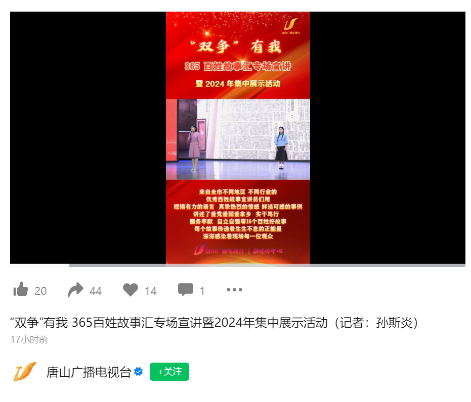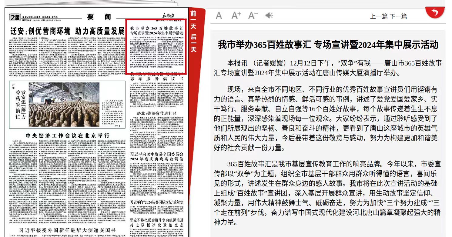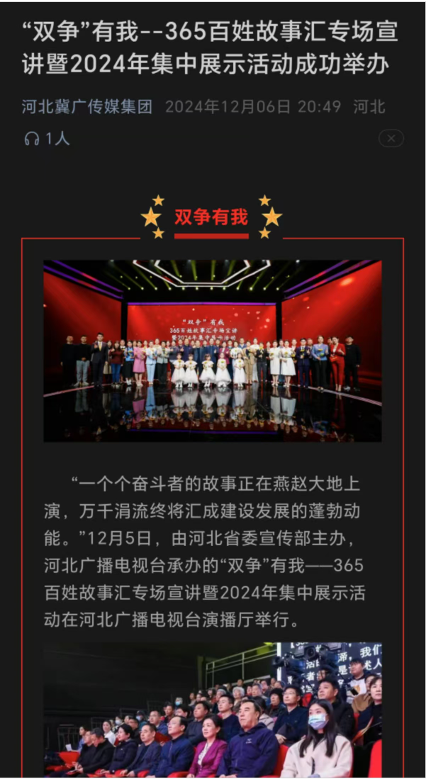 12月12日,“双争”有我——唐山市365百姓故事汇专场宣讲暨2024年集中展示活动在唐山传媒大厦演播厅举办,beat365宣讲员参与此次活动。