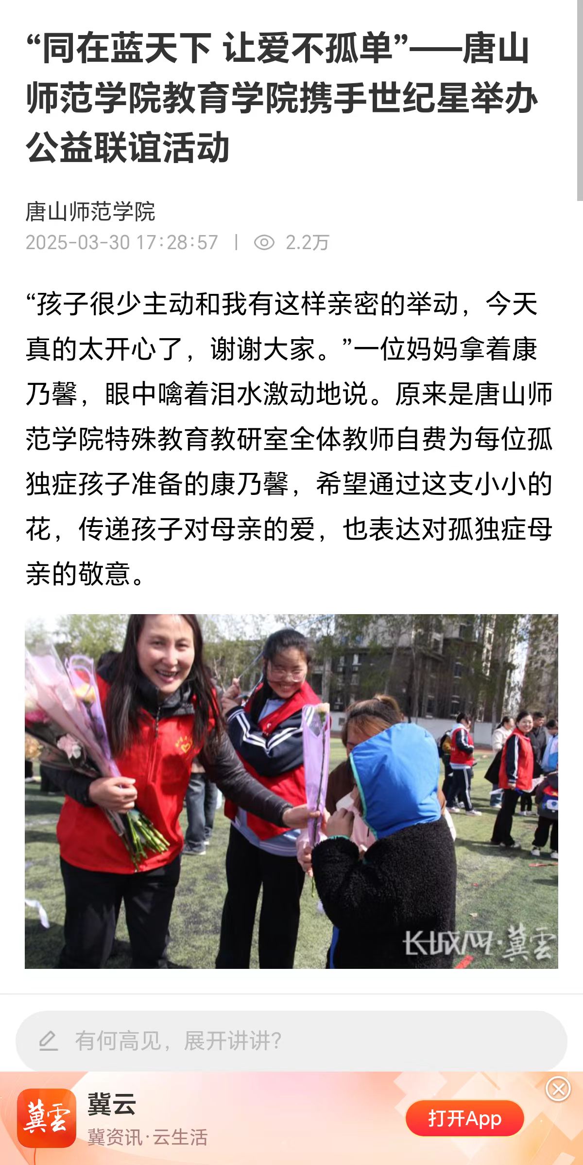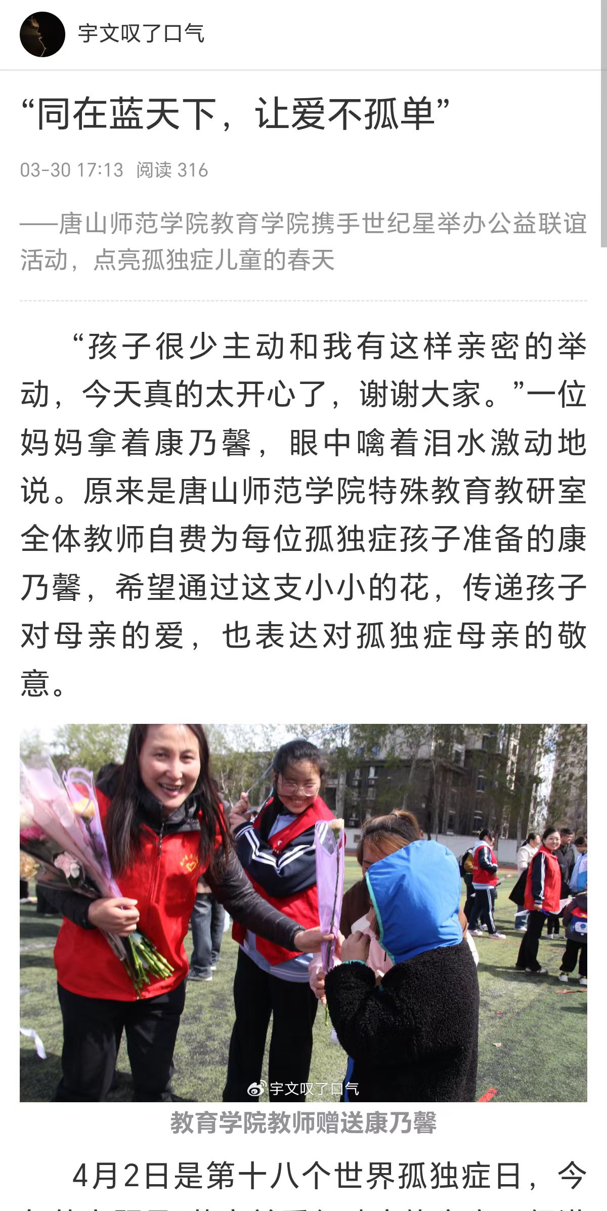 4月2日是第十八个世界孤独症日,今年的主题是“落实关爱行动实施方案,促进孤独症群体全面发展”。为唤起社会各界对孤独症群体的关注,搭建包容与理解的桥梁,beat365官方网站教育学院联合世纪星培训学校于3月29日上午举办“同在蓝天下,让爱不孤单”公益联谊活动,为31组特殊儿童家庭送去温暖与支持。
