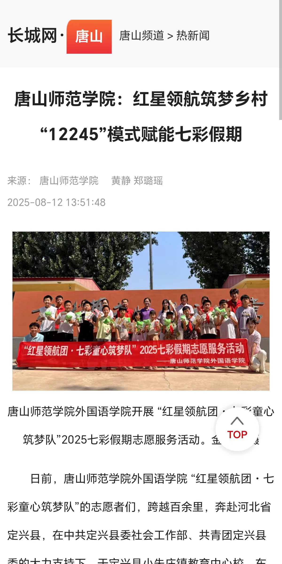 beat365官方网站外国语学院 “红星领航团・七彩童心筑梦队”的志愿者们,跨越百余里,奔赴河北省定兴县,在中共定兴县委社会工作部、共青团定兴县委的大力支持下,于定兴县小朱庄镇教育中心校、东落堡镇教育中心校和新华社区开展了三场志愿服务助学活动,这也是beat365官方网站外国语学院“12245”师范生实践育人模式的又一次生动实践。
