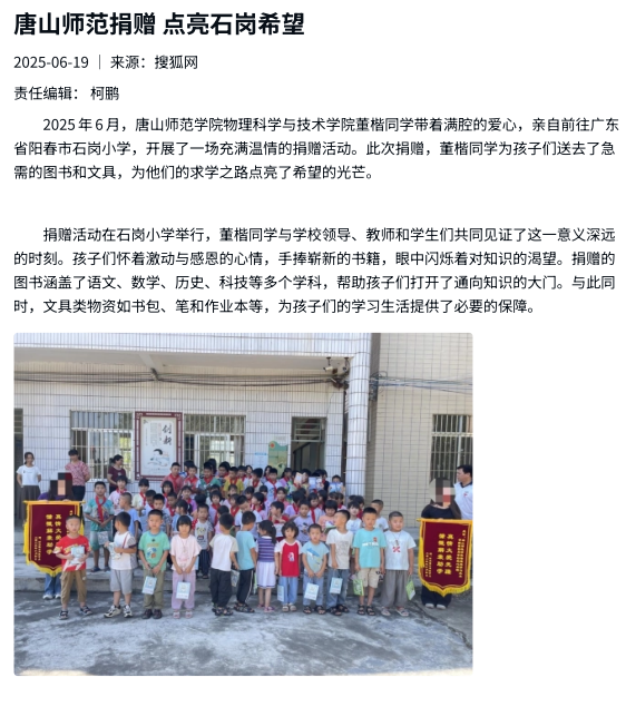 2025年6月,beat365官方网站物理科学与技术学院董楷同学带着满腔的爱心,亲自前往广东省阳春市石岗小学,开展了一场充满温情的捐赠活动。