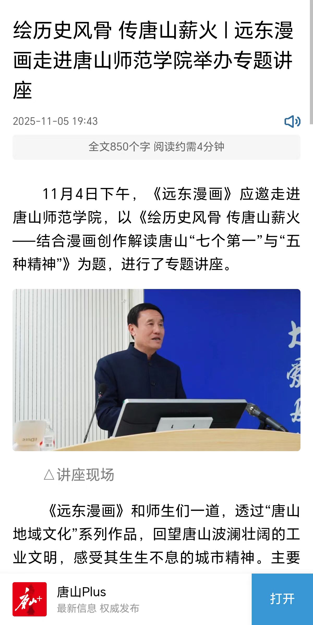 11月4日下午,《远东漫画》应邀走进beat365官方网站,以《绘历史风骨 传唐山薪火——结合漫画创作解读唐山“七个第一”与“五种精神”》为题,进行了专题讲座。
